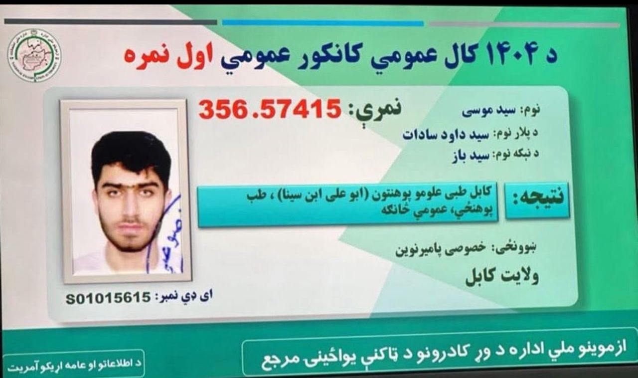 According to the authority, Sayed Musa, a resident of Kabul province, secured the first position in this year’s Kankor by scoring 356 points and was admitted to the medical faculty of Kabul University.